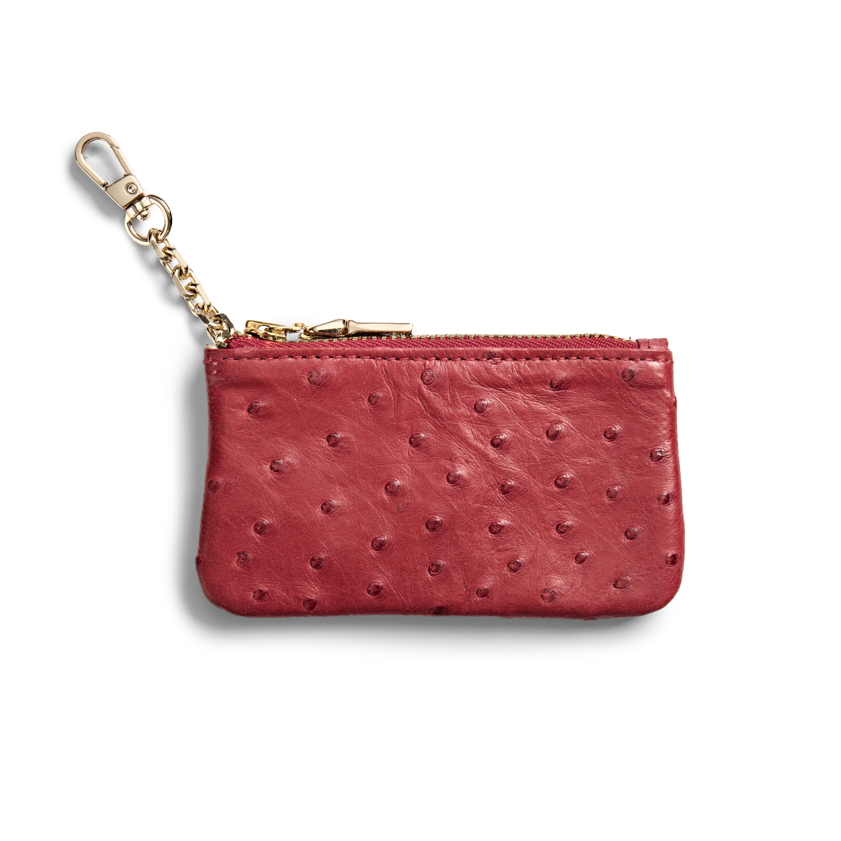 WasZAR 750.00 NowZAR 450.00 Leather type: Ostrich Leather Details Top zip closure Gold chain on a snap hook Leather lined interior Made in South Africa Size Height: 6.5cm Width: 11.5cm Depth: 1cm Chain drop: 8cm